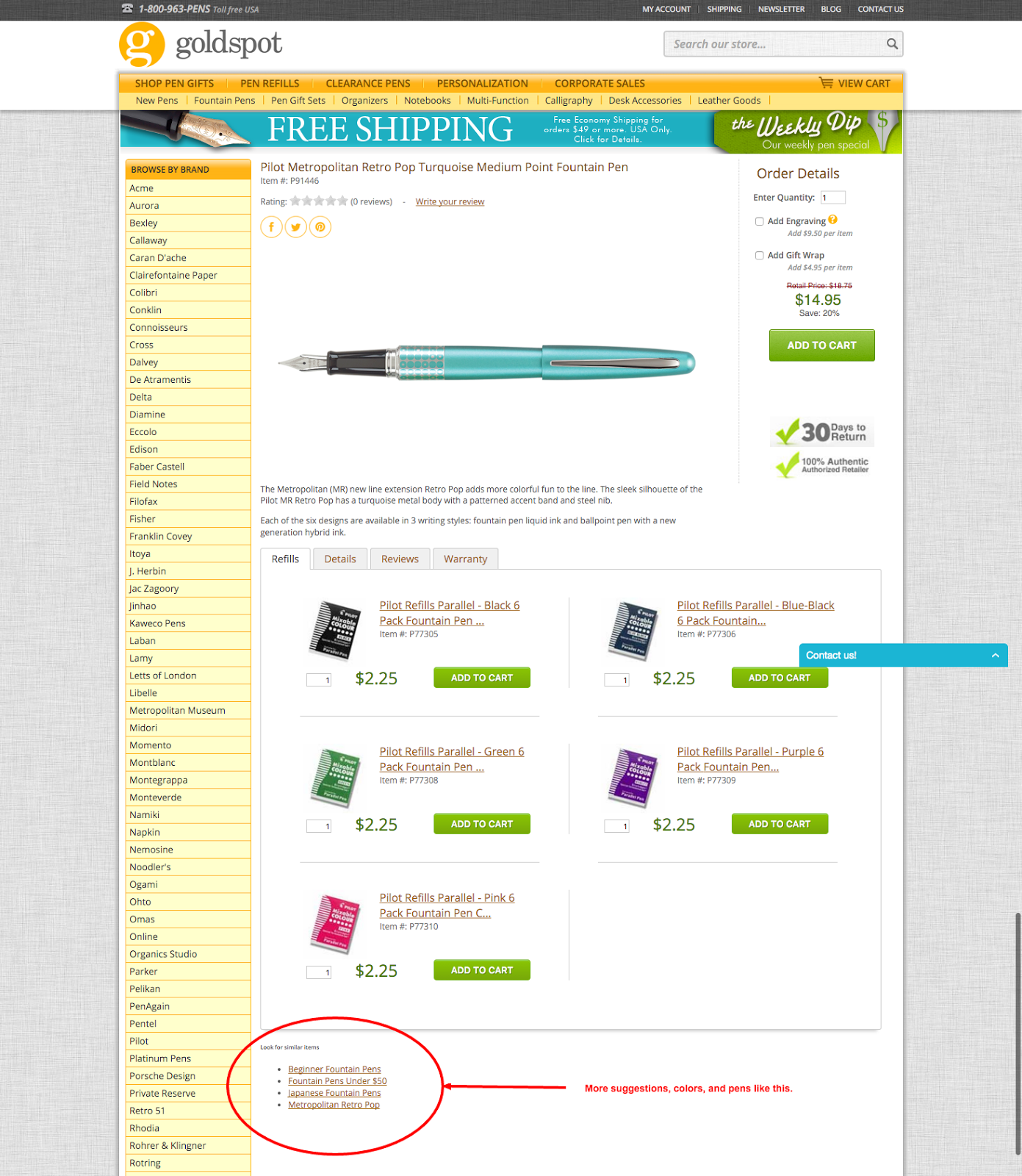 If you like one of the pens on this list, but are curious to see if comes in different colors or point sizes, click on the related items links at the bottom of the product detail page. In the example below, if you want to look at ALL the Pilot Metropolitan Retro Pop pens, colors and point sizes, you would click on the link that reads Metropolitan Retro Pop.