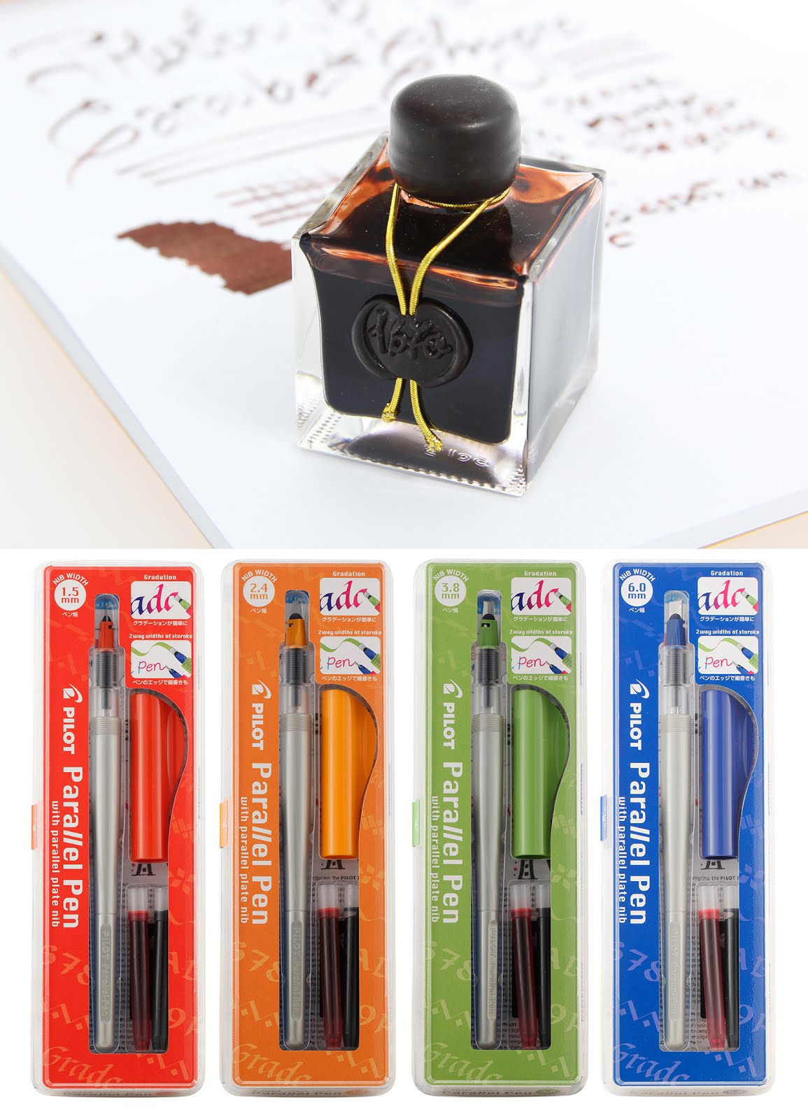 The East meets West as a French ink is paired up with its perfect match in the Japense Pilot Parallel calligraphy fountain pen. Pilot's parallel plate technology is a champ in getting a large amount of ink down on the page, while maintaining crisp edges of every stroke. If you're looking for a versatile selection of nib widths, check out the Pilot Parallel 4-pack with J. Herbin Caroube de Chypre combo. It includes the necessary CON-50 twist converter to extract the sparkly ink from the bottle.