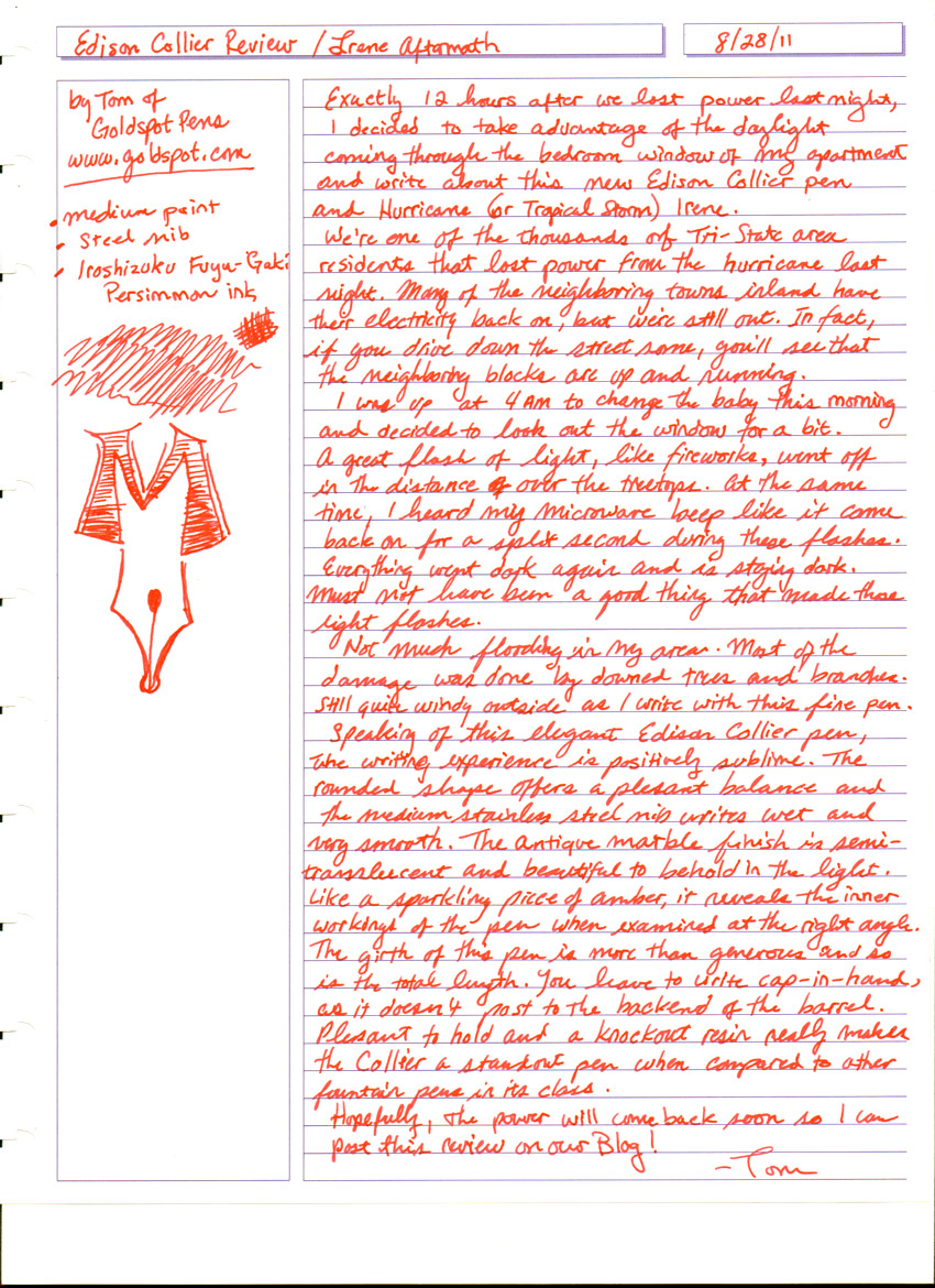 The smoothness of the medium point on this steel nib had actually tricked my Father in thinking it was a gold nib. The flow is wet and generous with no skipping. It writes marvelously and the larger size allows for more stability and control, while contributing very little to hand fatigue. You can read the handwritten review below for more of my thoughts on the pen and on Hurricane Irene.