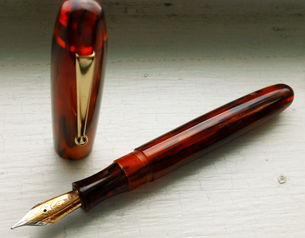 Brian "spared no expense" when it came to these brilliant acrylic styles. The Antique Marble is translucent amber with striations of black and pearlescent orange. It is both alluring and fascinating to study in the direct sunlight or, most likely, lamplight. The gold plated clip and bi-color, gold-plated, stainless steel nib add a detail of warmth and sophistication to the body material.