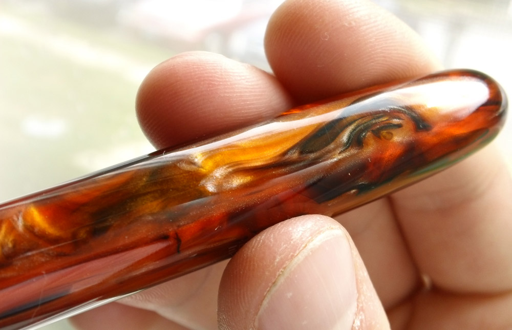 Brian "spared no expense" when it came to these brilliant acrylic styles. The Antique Marble is translucent amber with striations of black and pearlescent orange. It is both alluring and fascinating to study in the direct sunlight or, most likely, lamplight. The gold plated clip and bi-color, gold-plated, stainless steel nib add a detail of warmth and sophistication to the body material.
