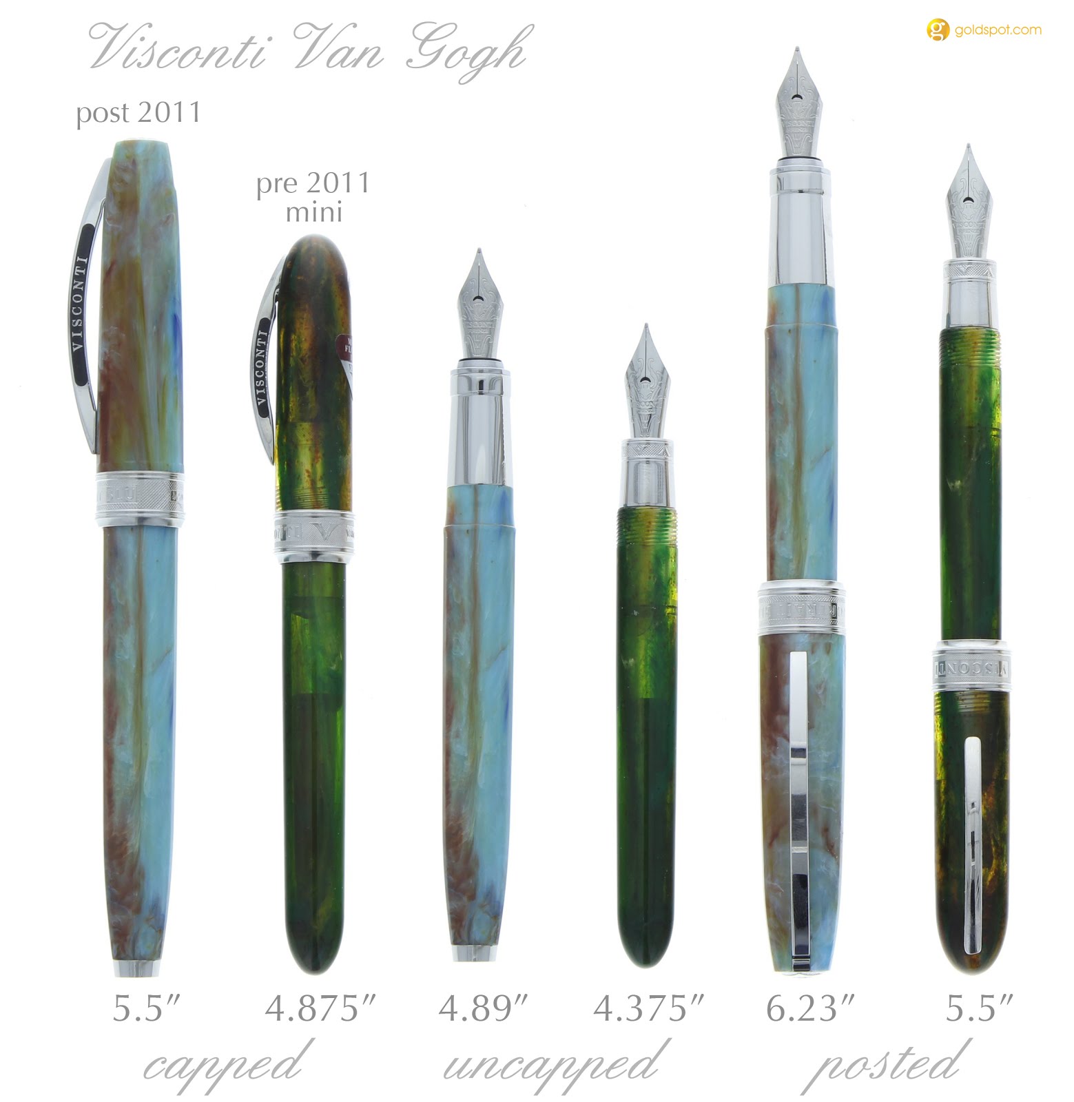 The Van Gogh Mini fountain pen measures 4.875" long closed, 4.375" with cap removed, 5.5" long with cap posted on back end. It is not as small as a Kaweco Sport pen, which measures 4.13" long closed and 5.3" long with cap posted, but it is smaller than the newer Visconti Van Gogh Impressionist pens (5.5" closed, 6.23" with cap posted).