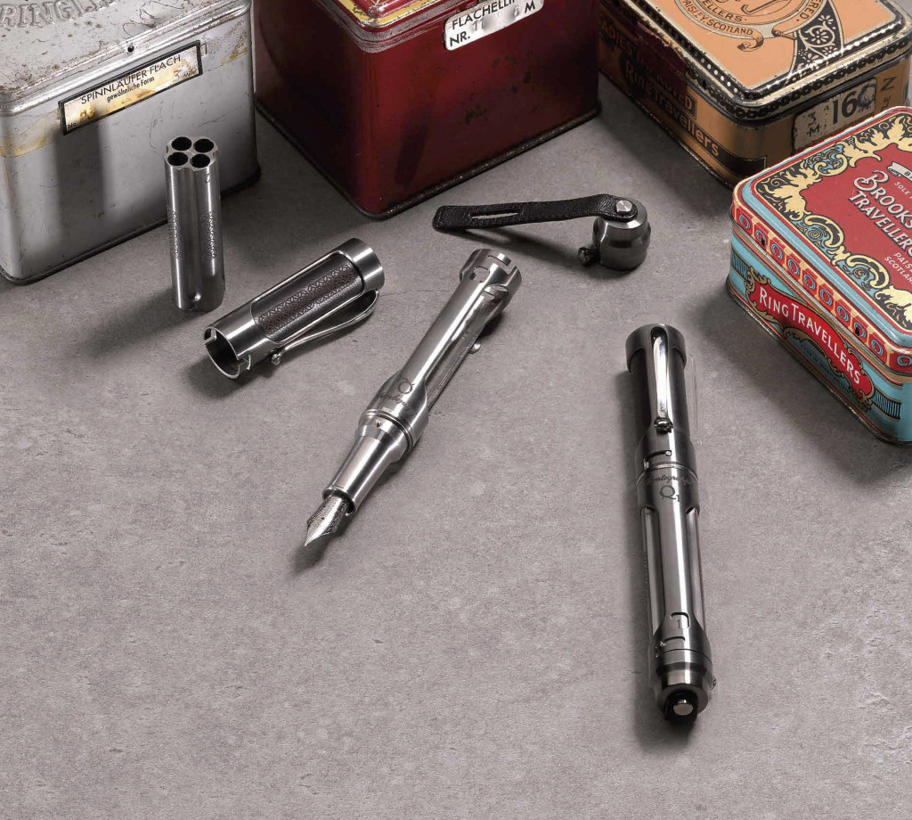 The Q1 is limited to 100 pieces world wide and is crafted from solid titanium and genuine Italian leather. The design of the pen is reminiscent a revolver pistol. The cap and blind cap unlatch with a bolt-action lock mechanism. The blind cap is attached with a piece of leather to keep the cap from being misplaced while changing ink colors.