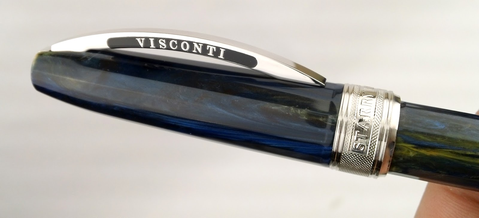 The pen's cap has three neat features which are particularly useful. The cap utilizes magnetism to seal with the barrel of the pen. It securely attaches on the front end of the pen with little effort and stays on strong enough to withstand firm agitation and shaking. Although it does not magnetically attach to the back-end while posted, the cap does securely post well and is very comfortable to write with while doing so (posted length 6.125"). Another feature of the cap is the spring-loaded Visconti Clip. It is easy to remove and attach to your pocket, but once latched on, is very sturdy. Lastly, you can personalize your