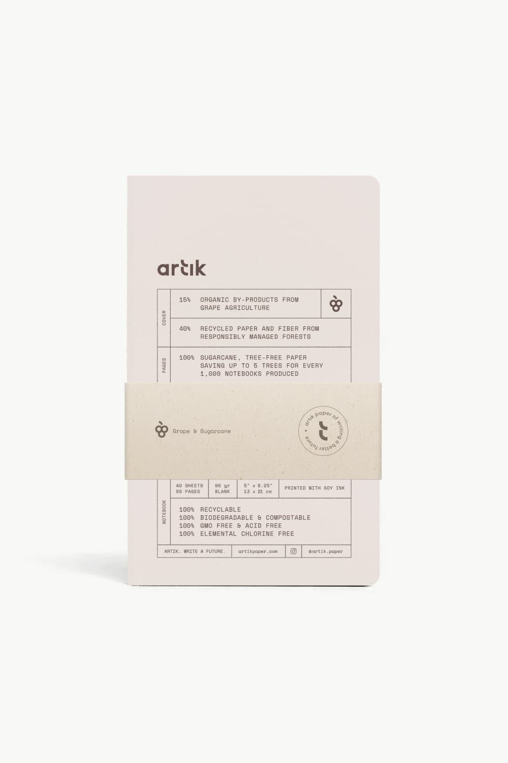 - Hardcover: 15% made from Grape agriculture & 40% recycled paper + fibers from responsibly managed forests