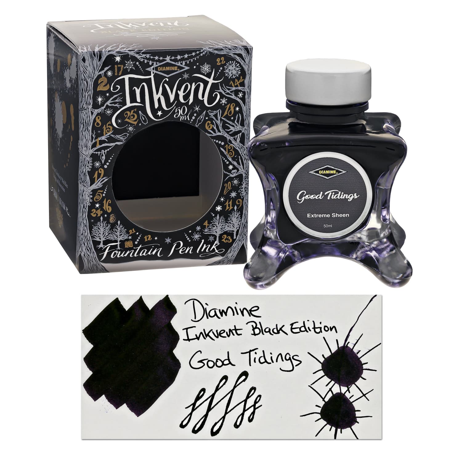 Good Tidings is a black-purple base ink with an intense sheen that gives a fresh and luxurious feel, ideal for bold statements and festive writing.