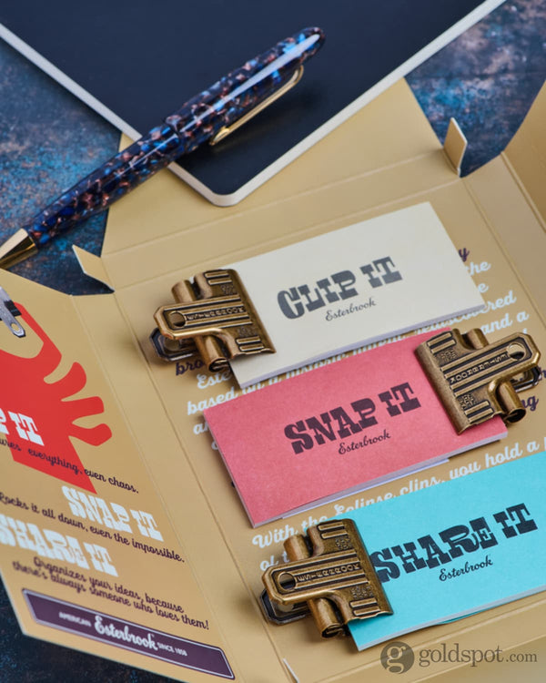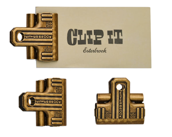 The Esterbrook Eclipse Clip is a vintage-inspired page clip available in Raw Brass and Silver-Plated finishes. Modeled after original designs from the early 1900s, it features a functional ball-bearing hinge and finely etched detailing, including the original patent number. Each clip is designed to securely hold pages in journals, notebooks, or ledgers while adding a touch of nostalgic character. The set includes three Eclipse Clips and three small sticky note booklets. A thoughtful companion for journaling and writing, ideal for those who value classic design and practical elegance.