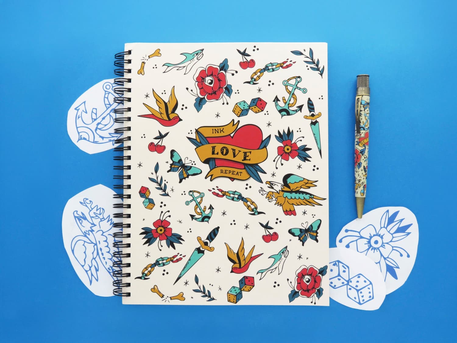 This tattoo-inspired spiral sketchbook is packed with bold attitude and classic flair. The cover bursts with bright colors, thick lines, and timeless symbols of luck, love, and rebellion—paying homage to the American Traditional tattoo style that never goes out of fashion. Inside, you'll find smooth, quality pages ready for your boldest doodles, wildest sketches, or everyday notes. Whether you're drawing, journaling, or just daydreaming, this sketchbook is here to bring a flash of flair to your creative flow.