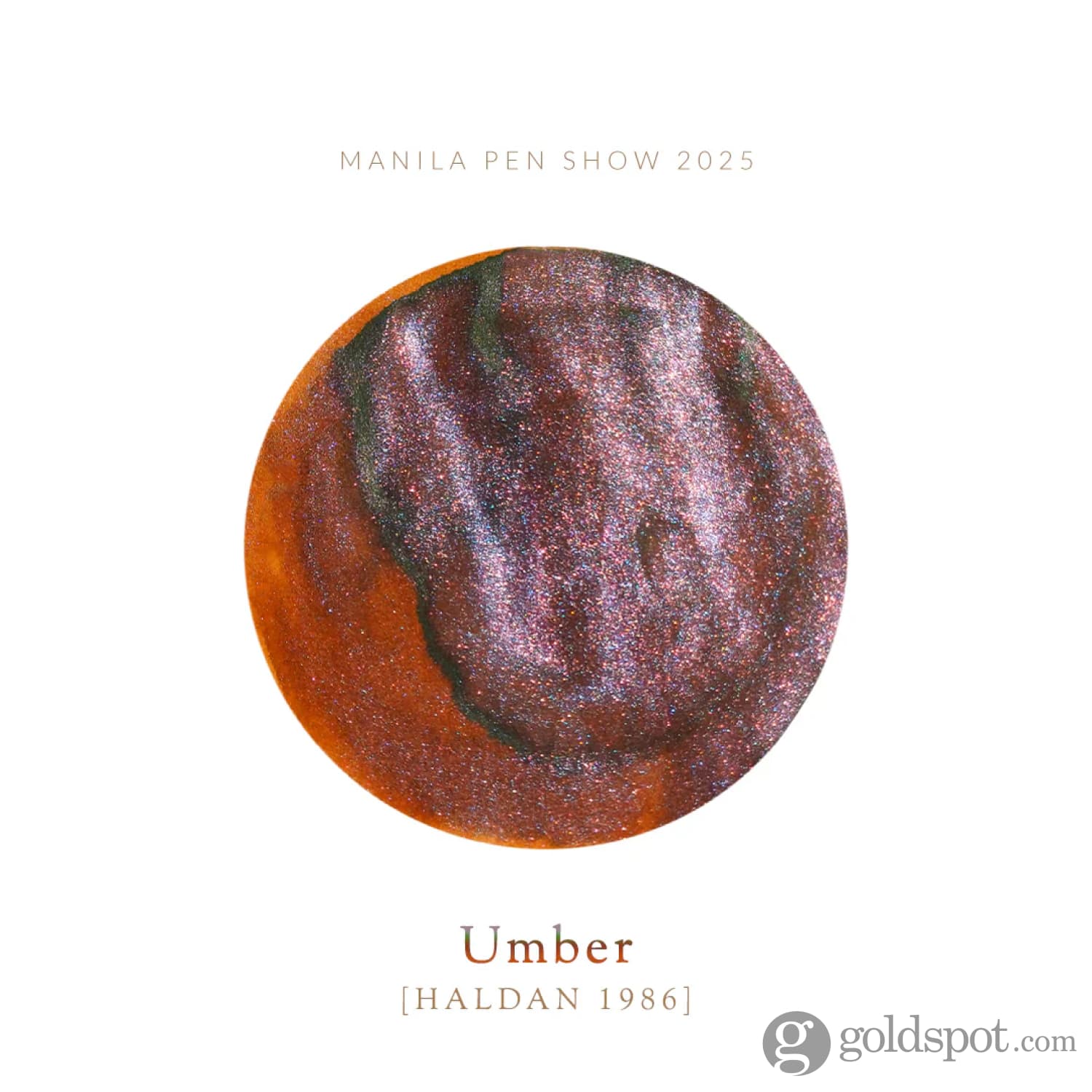 This ink features a burnt sienna base with an ivy-green sheen, accented by a mixed-metallic shimmer that catches the light with flashes of blue and copper.