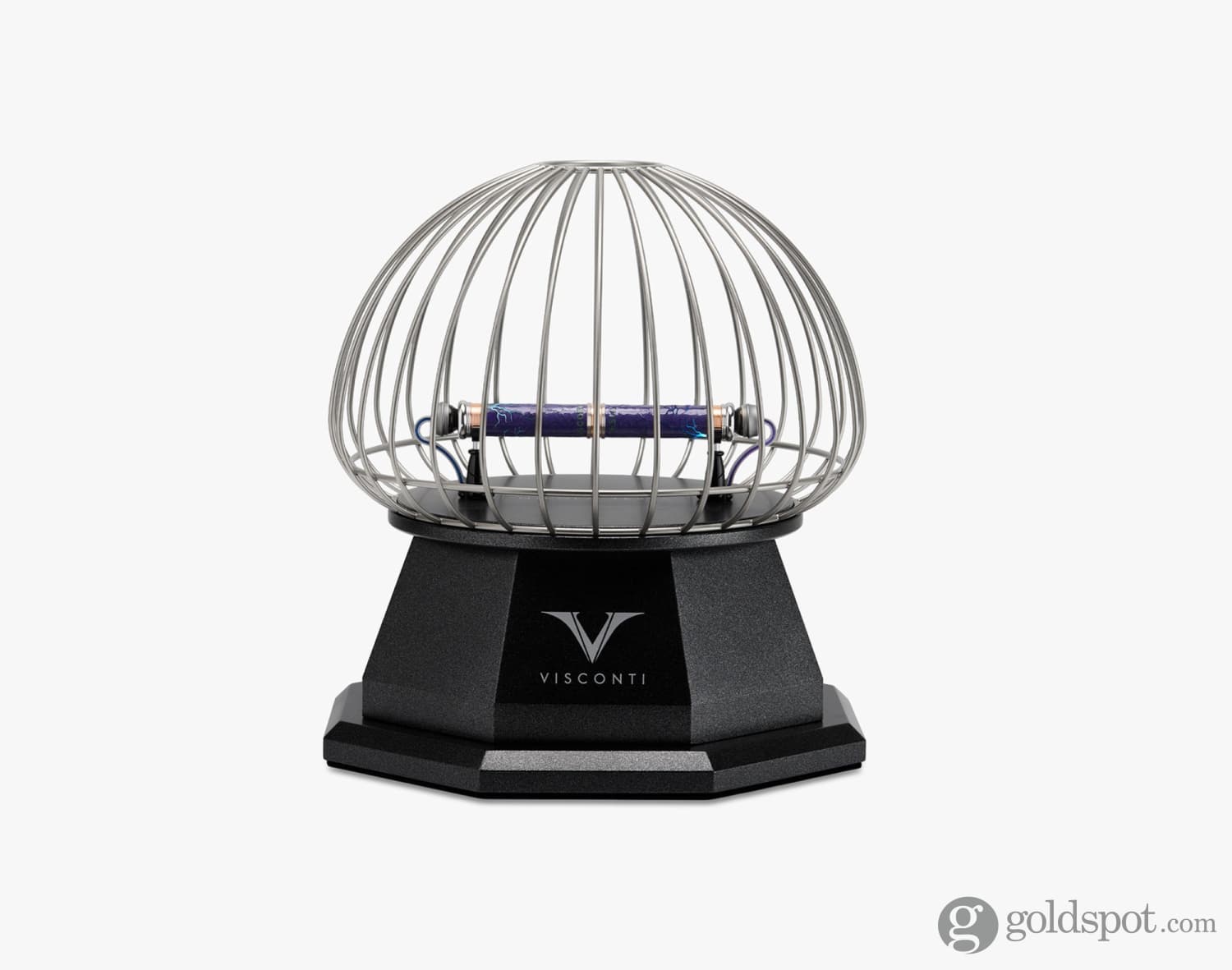 - Presentation Box: Tesla tower-inspired stand with built-in light; activates the pen’s fluorescence, making lightning bolts glow ice blue