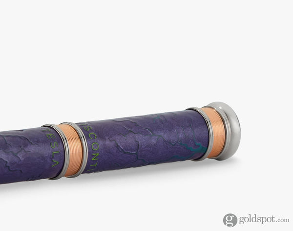 The metallic purple enamel base provides a bold contrast to the raised “Tesla” and “Visconti” inscriptions, enameled in lime green. Inside the toroid cap, a transparent acrylic disc bearing the Visconti “V” appears suspended, echoing Tesla’s ambition to reveal the hidden forces of nature. The pen is accented with three rose gold-plated brass rings that echo copper coil windings, strategically placed for symmetry and elegance.