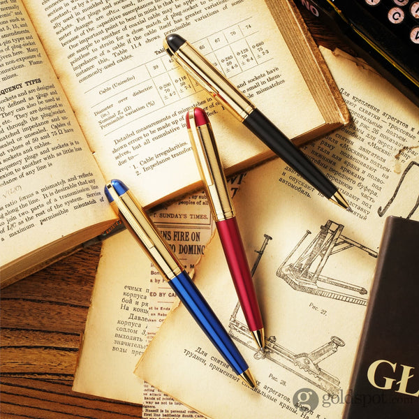 Each pen is carefully restored and tested for performance and quality. Ballpoint pens are available in Black, Blue, and Red color finishes, with matching gold/silver trim. Also available in Fountain and Rollerball pen versions.